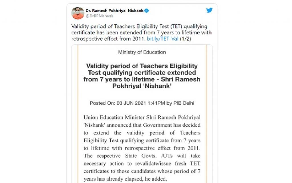 టీచర్ ఉద్యోగార్థులకు కేంద్ర ప్రభుత్వం శుభవార్త చెప్పింది. ఉపాధ్యాయ అర్హత పరీక్ష (టెట్) క్వాలిఫైయింగ్ సర్టిఫికెట్ ఏడేళ్ల నుంచి జీవితకాలం పొడిగించింది. ఈ పొడిగింపు 2011 నుండి వర్తిస్తుంది. ఈ శుభవార్తను కేంద్ర విద్యాశాఖ మంత్రి రమేష్ పోఖ్రియాల్ నిశాంక్ ప్రకటించారు. ఇప్పటికే ఏడేళ్ల కాలం పూర్తయిన అభ్యర్ధులకు కొత్తగా టీఈటీ సర్టిఫికెట్లు జారీ చేయడానికి లేదా పాత వాటిని రీవ్యాలిడేట్ చేయడానికి అవసరమైన చర్యలను తీసుకోవాలని రాష్ట్ర కేంద్ర పాలిత ప్రాంతాల ప్రభుత్వాలను కేంద్ర ప్రభుత్వం కోరింది. ఉపాధ్యాయ వృత్తిని చేపట్టాలనుకునేవారు టీఈటీలో ఉత్తీర్ణులు కావాల్సి ఉంటుంది. 2011 ఫిబ్రవరిలో నేషనల్ కౌన్సిల్ ఫర్ టీచర్ ఎడ్యుకేషన్ (ఎన్సీటీఈ) జారీ చేసిన మార్గదర్శకాల ప్రకారం రాష్ట్ర ప్రభుత్వాలు టీఈటీని నిర్వహిస్తాయి.